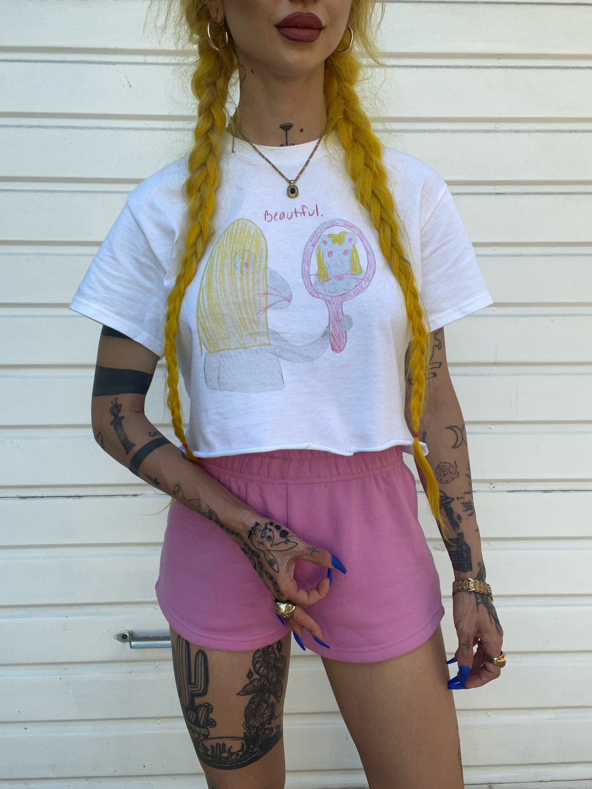 she's beautiful inside & out but it's funny because she's just a rat and she's scrappy and also so sexy. *COMES AS A FULL LENGTH SHIRT* my vision of any shirt is with the bottom seams ripped but- to each their own at any length!